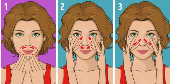 Động tác đầu tiên là áp lòng bàn tay vào má rồi vuốt từ thái dương sang hai bên xương quai xanh. Làm điều này 3 lần.