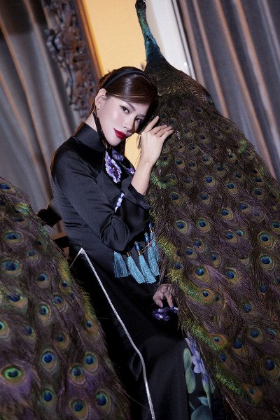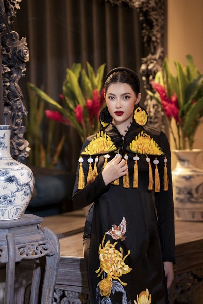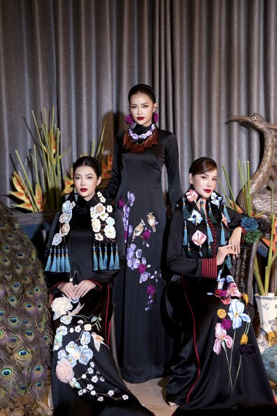 Trong bộ sưu tập này, sắc đen nguyên bản của Lãnh Mỹ A được giữ nguyên, điểm xuyết những gam màu nổi bật như trắng, đỏ, hồng, vàng, tím qua các họa tiết trên thân áo. Phom dáng vẫn giữ nét đặc trưng của áo dài truyền thống nhưng được cách tân phù hợp với cuộc sống đương đại với chi tiết tay phồng, cổ tròn, đính nơ.