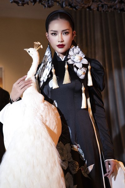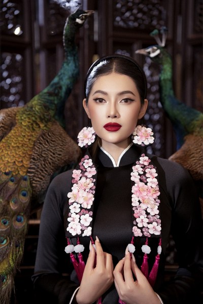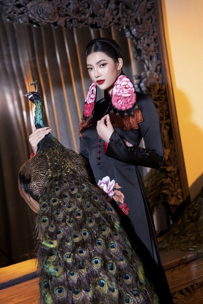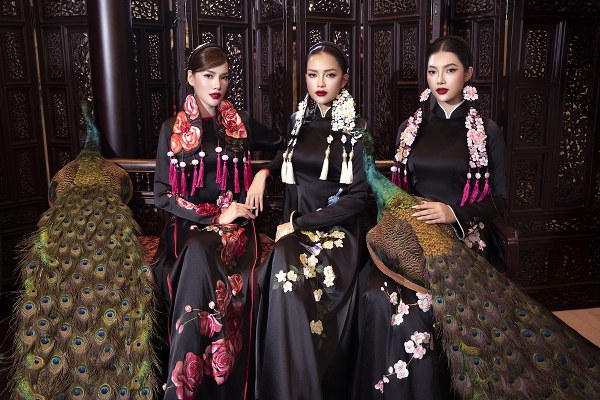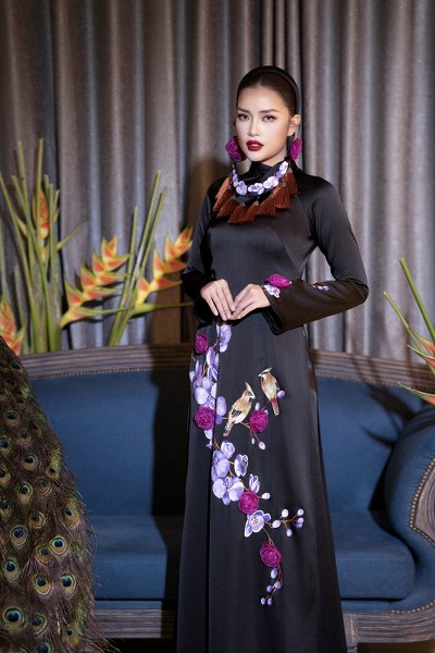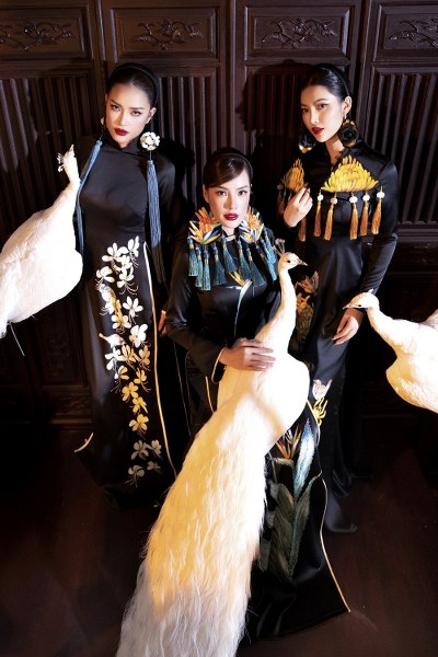 Họa tiết hoa, lá và chim trên thân áo được thực hiện thủ công với kỹ thuật vẽ trang trí, đính kết và thêu tay, tạo hiệu ứng 3D sinh động. Mỗi bộ áo dài còn được phối hợp kỹ lưỡng với phụ kiện như băng đô cài đầu và hoa tai tua rua, tất cả đều được chế tác thủ công trong hơn 30 ngày.