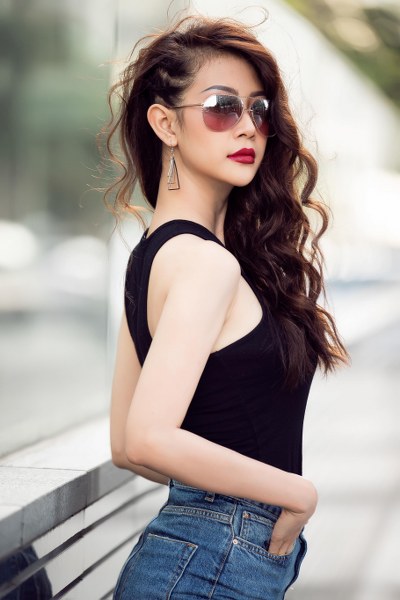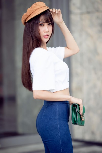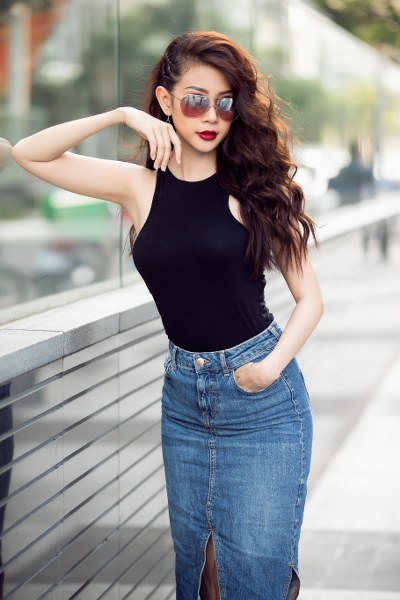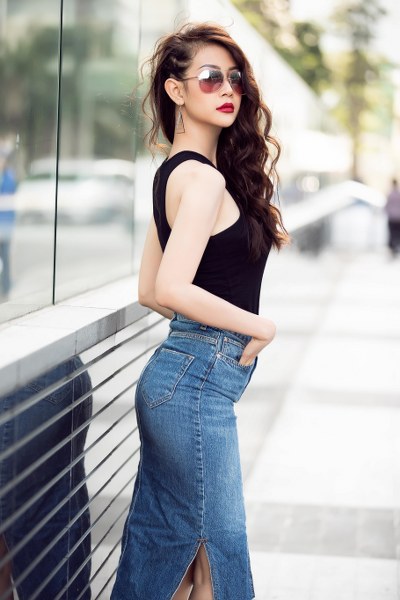 Á Hậu khoe đường cong bắt mắt cùng thiết kế áo ôm sát nách và váy jean xẻ tà nhẹ