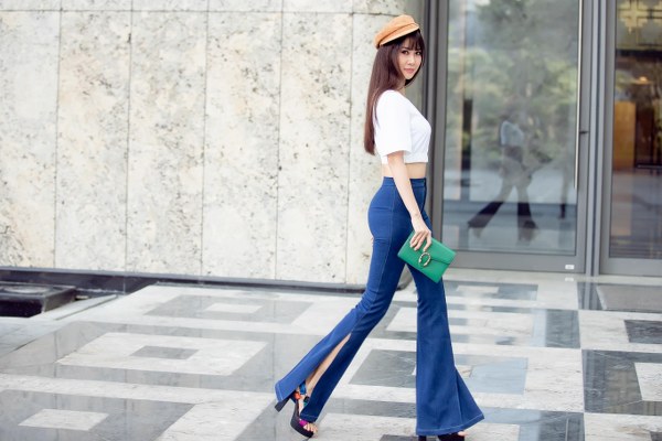 Không còn những chiếc quần ống loe dài đến gót chân, với chiếc ống có đường kinh rộng che kín bàn chân mà nó được may bó sát lấy thân người, những đường cắt may xẻ lạ đến tầm bắp chân là điểm nhấn khiến người mặc nhìn cao hơn, thon gọn hơn.