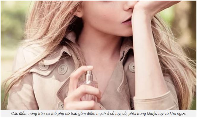 Các điểm nóng trên cơ thể phụ nữ bao gồm điểm mạch ở cổ tay, cổ, phía trong khuỷu tay và khe ngực