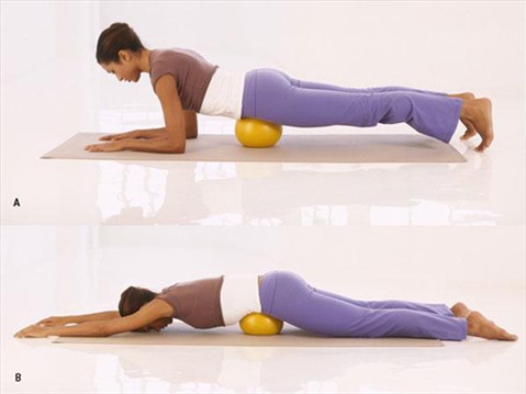 A. Tư thế nằm úp, quả bóng nằm dưới bụng dưới, hai tay để chống khuỷu phía trước, hai chân duỗi thẳng. Gập hơi cong chân lăn bóng dưới bụng dưới sao cho nằm sâu trong bóng khoảng 30 giây kết hợp hít vào. Trở lại tư thế nằm úp ban đầu kết hợp thở ra.