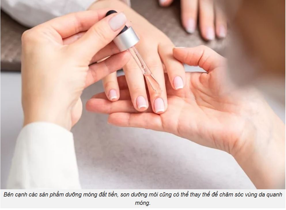 Bên cạnh các sản phẩm dưỡng móng đắt tiền, son dưỡng môi cũng có thể thay thế để chăm sóc vùng da quanh móng. Bạn chỉ cần thoa một ít son dưỡng không màu lên vùng da quanh móng tay đã được làm sạch, massage nhẹ nhàng, nhất là vào buổi tối, để dưỡng chất thẩm thấu và nuôi dưỡng da. Cách này giúp hạn chế tình trạng khô da và nứt nẻ quanh móng.