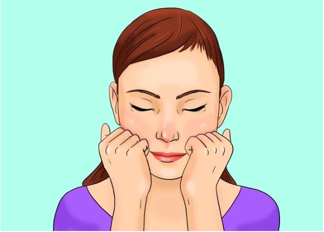 Làm mịn vùng má: Đan 2 bàn tay vào nhau nhưng ngón tay cái vẫn giữ thẳng. Sau đó bạn đặt đầu ngón cái tay phải dưới mắt trái, vừa ấn nhẹ vừa trượt về hướng theo phía tai. Sau đó, trượt tiếp ngón cái từ tai xuống xương đòn. Sau đó thực hiện lại quy trình này với má bên kia.