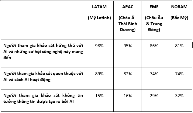Thái độ của người dùng về AI có sự khác biệt rõ rệt giữa các khu vực trên thế giới. Mỹ Latinh (LATAM) dẫn đầu toàn cầu về thái độ tích cực và sự quen thuộc đối với AI, với 98% người được khảo sát hứng thú với AI và 89% hiểu cách thức hoạt động của công nghệ này. Tiếp đến là khu vực Châu Á – Thái Bình Dương (APAC). Người dùng ở khu vực này thể hiện mức độ sẵn sàng tích hợp AI vào cuộc sống hằng ngày cao nhất - 41% sử dụng AI cho việc di chuyển và 41% ứng dụng trong giáo dục. Riêng đối với Việt Nam, số liệu này là 59% dùng cho các mục đích học tập và 48% dùng cho việc di chuyển, thể hiện mức độ cởi mở đang gia tăng đối với các ứng dụng AI có thể giải quyết nhu cầu thực tế của người dùng.