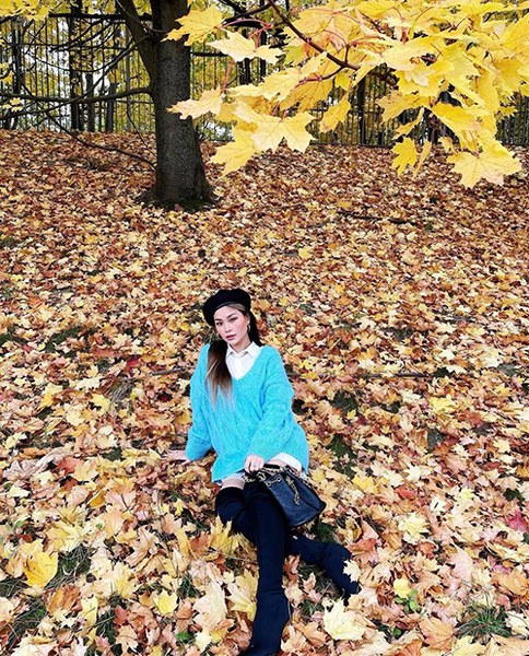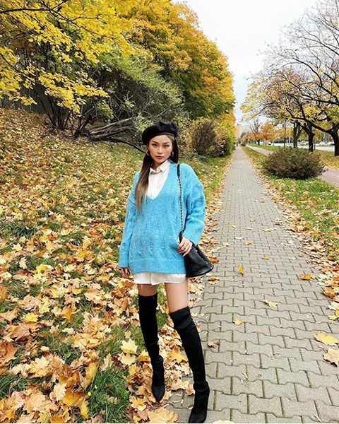 Diện áo len tông màu hot trend, Diễm Trang phối màu ton-sur-ton cho mũ beret, boot cao cổ và túi Chanel.