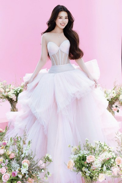 Trong loạt hình, nàng hậu diện những thiết kế váy trắng bồng bềnh, kết hợp cùng không gian được phủ đầy hoa tươi và tông màu pastel chủ đạo như hồng phấn, xanh baby.