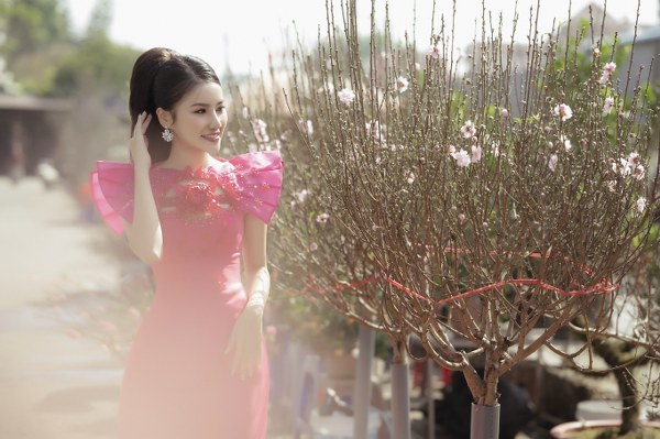 Áo dài sắc đỏ thắm - màu truyền thống của trang phục Việt khi đón xuân cũng được cô nàng chọn lựa để diện Tết.