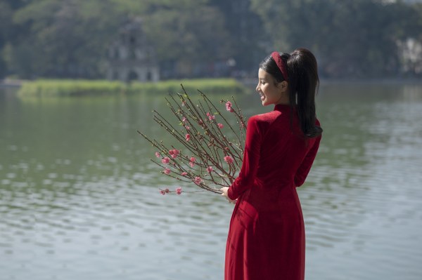 Trong tiết trời se lạnh của mùa xuân đất Bắc, bên cạnh những phong tục truyền thống, cành đào khoe nụ trong gió xuân cũng không thể thiếu những tà áo dài của các cô thiếu nữ.