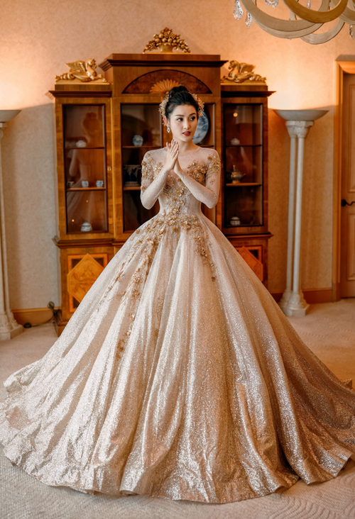 Váy cưới xòe bồng công chúa với chất liệu ánh kim lộng lẫy ‘hô biến" Á hậu Huyền My thành nàng công chúa bước ra từ câu chuyện cổ tích ngày xưa. Bộ váy được nhà thiết kế tạo hình cổ hai trong một để khoe khéo nét đẹp của cô dâu trong ngày cưới