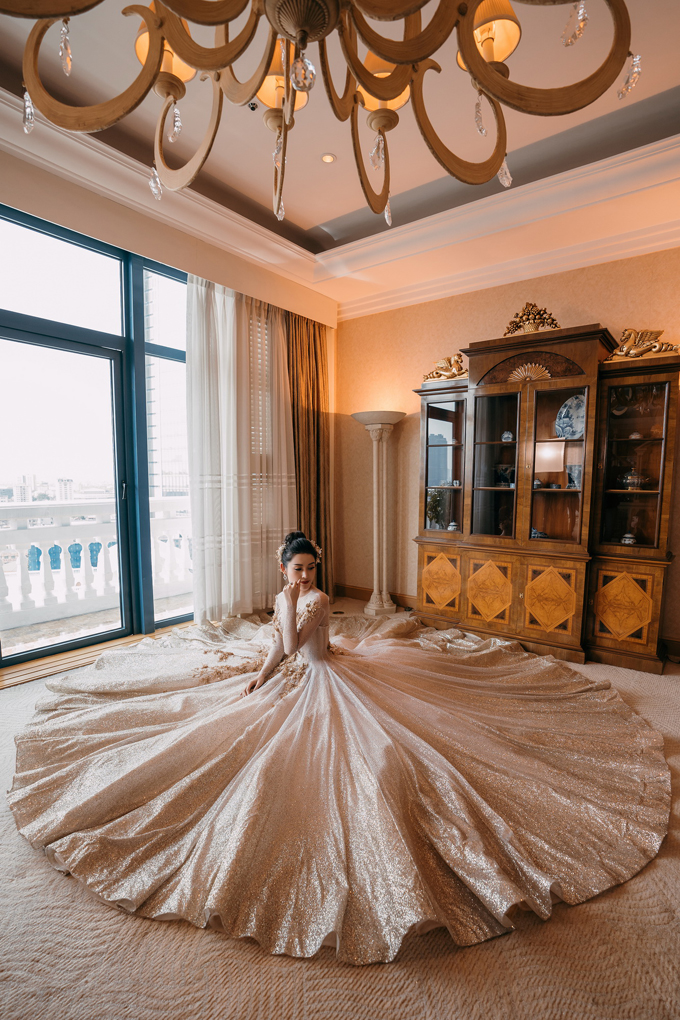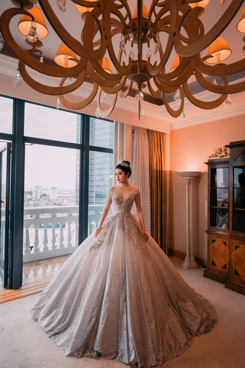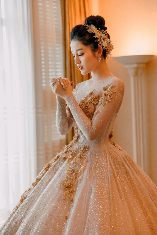 Chiếc váy được đính kim sa thủ công, tỉ mỉ, thích hợp cho các cô dâu yêu thích phong cách sang trọng. Điểm nhấn chính là phần ngực áo và thân váy được đính hoa thêu nổi, tạo nên nét tinh tế và mềm mại. Tóc cô dâu được búi cao và cài bờm đá lấp lánh