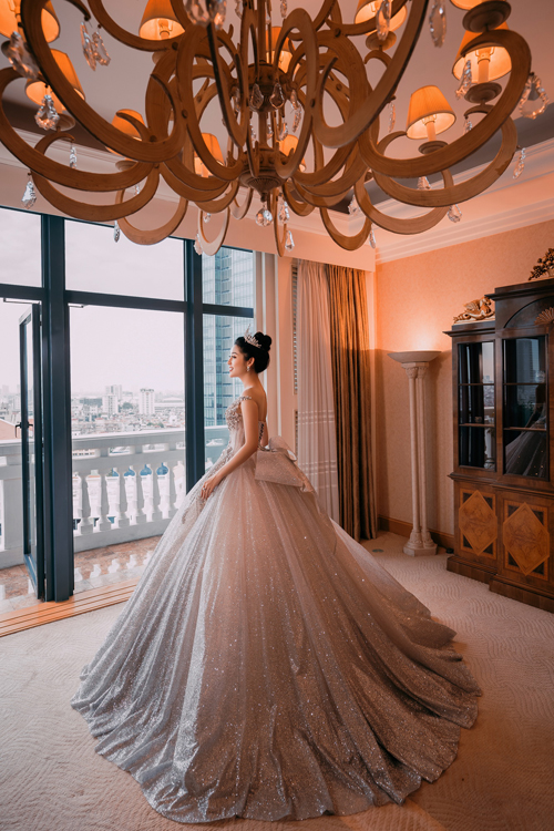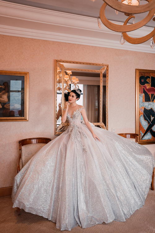 Một thiết kế váy xòe công chúa khác với tông bạc trắng lấp lánh mang đến vẻ sang trọng, kiêu sa cho người mặc. Chiếc váy có trọng lượng lên tới 25kg