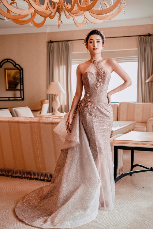 Á hậu Huyền My khoe vẻ đẹp "nữ thần" với thiết kế này. Mẫu váy được khai thác theo phom dáng corset, tôn lên vẻ đẹp hình thể của người phụ nữ. Họa tiết ren đính đá và thêu nổi nơi ngực áo tạo sự kiêu sa và hơi hướng phương Tây cổ điển