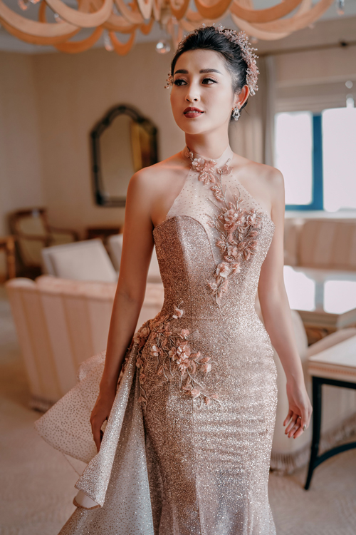 Huyền My diện váy lấp lánh với thiết kế cổ hai trong một gồm cổ yếm và cổ cúp ngực. Họa tiết hoa được đính từ cổ đến ngực áo và ngang hông cùng tông nâu đồng sáng với màu váy