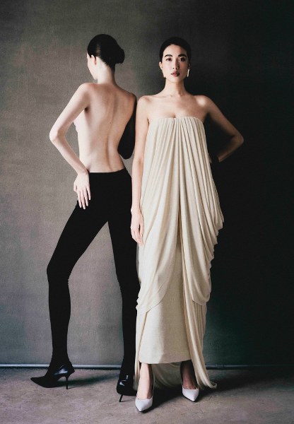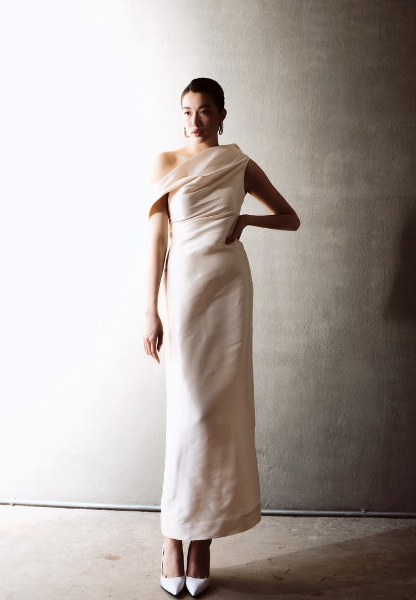Nhà mốt Việt hướng đến sự tối giản nhưng khai thác trọn vẹn đường cong cơ thể, đồng thời ưu tiên chất liệu bền vững, không gây kích ứng da như: lụa dệt nguồn gốc Việt Nam, organza, crepe, taffeta, cotton...