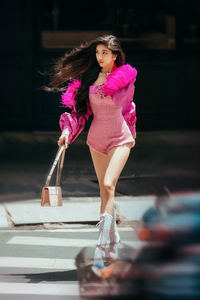 Á hậu 2 Hoa hậu Thế giới Việt Nam 2023 dạo phố nổi bật cùng bodysuit cúp ngực tông hồng, áo khoác đính lông vũ cùng màu. Cô cao 1,71m, số đo hình thể 80-61-90cm, hiện là sinh viên năm nhất ngành Quản trị kinh doanh tại Đại học Nông lâm TPHCM.