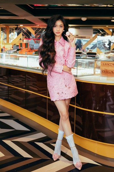 Á hậu 2 Hoa hậu Thế giới Việt Nam 2023 Huỳnh Minh Kiên gây chú ý với đôi mắt to, sống mũi cao, mái tóc dày, được nhận xét là có nét đẹp Tây. Cô vừa xuất hiện trong bộ ảnh thời trang ‘Look at me’, kết hợp cùng NTK Lê Thanh Hòa. Á hậu 19 tuổi khoe đôi chân dài với mini dress tông màu hồng với hoạ tiết hoa.