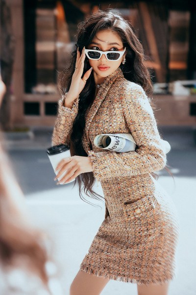 Người đẹp gốc Ninh Thuận diện váy ngắn cổ vest làm từ vải tweed, phối cùng kính mắt mèo. Cô cho rằng nếu phối các trang phục chất liệu vải tweed một cách tinh tế sẽ toát lên vẻ quý phái mà không mất đi nét trẻ trung, năng động.