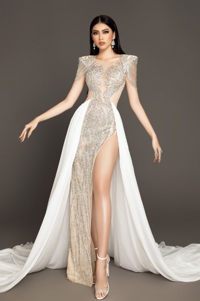 Á hậu Ngọc Thảo lựa chọn váy xẻ, tôn chân dài 1,1m cho đêm thi bán kết Miss Grand International 2020.