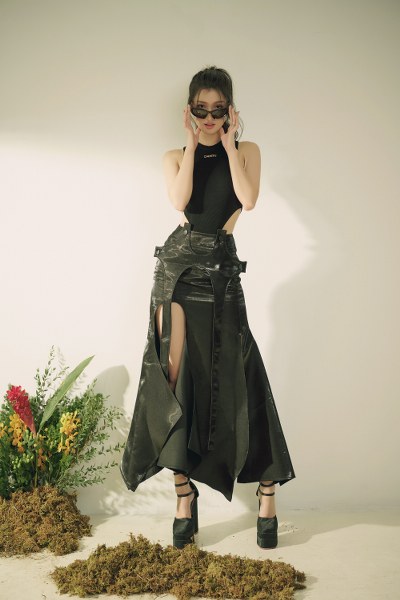 Bộ cánh thứ hai phá cách hơn với thiết kế bodysuit cut out bên hông phối chân váy da giúp nàng hậu khoe làn da nõn nà, cuốn hút. Sở hữu chiều cao 1m7, nàng hậu thả dáng đầy chuyên nghiệp qua từng shoot hình.