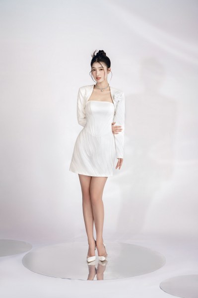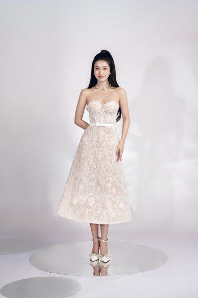 Người đẹp mặc đầm trắng cúp ngực tinh khôi, đính hoa dập nổi. Từng chi tiết trên chiếc váy đều mềm mại, uyển chuyển, đầy nữ tính.
