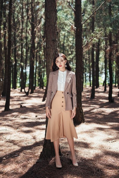 Được sinh ra để dành cho mùa Thu, tone màu nâu, beige cùng hoạ tiết plaid cổ điển thích hợp đi dạo phố hay công sở.