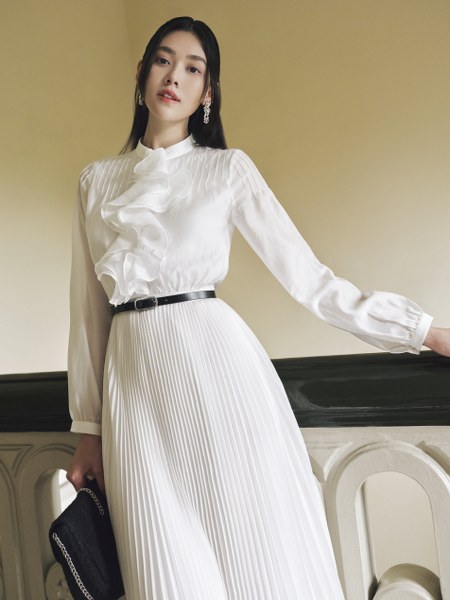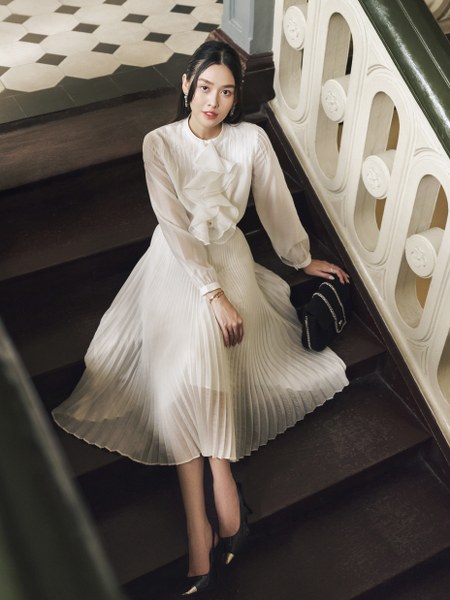 Với phong cách này, những trang phục có phom dáng cổ điển luôn chiếm đại đa số. Có thể kể đến như mẫu váy xòe A dáng dài với đường chiết eo sâu được xếp pli tỉ mỉ.