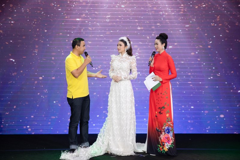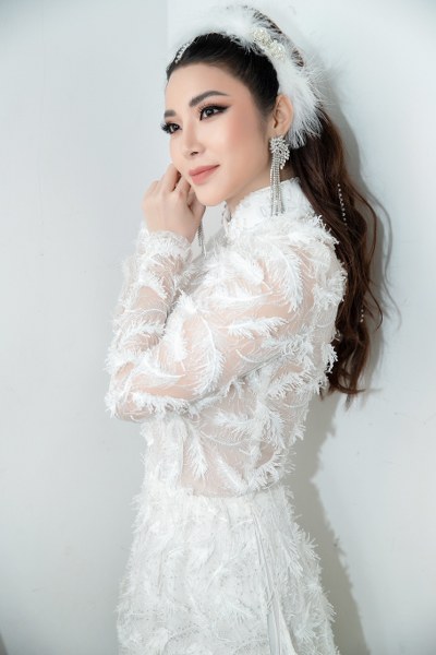 Trong đó, chiếc áo dài mang tên "Mỵ Châu" được lấy cảm hứng từ chính hình ảnh nàng Mỵ Châu xinh đẹp. Đây là bộ trang phục được cắt may trên chất liệu tơ cao cấp và được kết từ hàng nghìn cánh lông vũ.