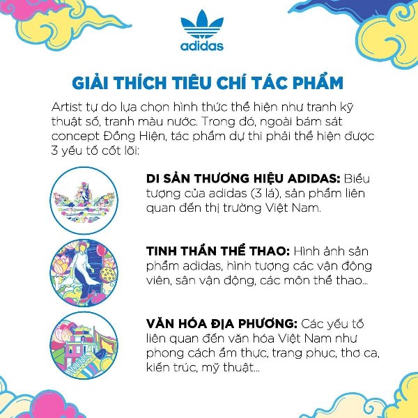 Cuộc thi dành cho tất cả các bạn trẻ Việt Nam từ 18 tuổi trở lên, yêu thích và tự hào về văn hóa đất nước, mong muốn được hiện thực hóa những ý tưởng mới lạ, táo bạo của mình. Từ chủ đề "Đồng hiện", người tham gia cần tạo ra một tác phẩm hội tụ đủ ba yếu tố: di sản thương hiệu adidas (biểu tượng logo 3 lá kinh điển của adidas), tinh thần thể thao (các hoạt động, dụng cụ tập luyện thể thao, hình ảnh vận động viên…) và văn hóa địa phương (các hình ảnh gợi lên nét văn hóa riêng biệt chỉ có tại Việt Nam, được khai thác tự do từ các chất liệu trong kiến trúc, mỹ thuật, văn học, ẩm thực, âm nhạc…). Hình thức bài dự thi có thể thể hiện đa dạng thể loại từ tranh kỹ thuật số đến tranh màu nước, tranh in trên vải…
