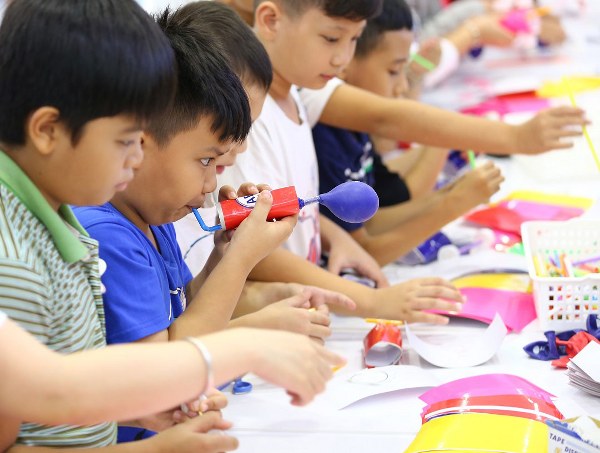 Các bé thiếu nhi bước vào thử thách "Balloon car – STEAM Challenge" với sự quyết tâm và hào hứng