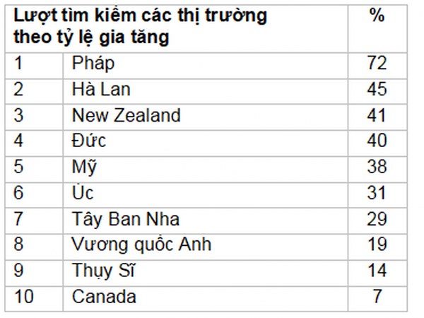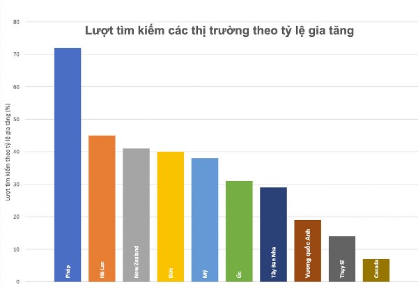 Đứng đầu là mức tăng đáng kể về số lượt tìm kiếm nơi lưu trú của du khách đến từ Pháp khi tăng 72% trong hai tuần sau thông báo, so với hai tuần trước đó.