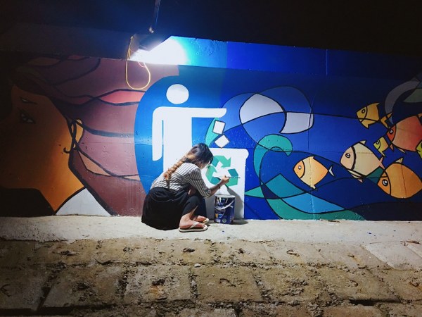 Bức tranh minh họa cho hệ quả "Con người xả rác – Cá ăn rác – Con người ăn cá" được nhóm họa sĩ, giảng viên và sinh viên ĐH Mỹ thuật Công nghiệp Hà Nội hoành thành sau hai đợt vẽ kéo dài gần 20 ngày dưới thời tiết thất thường.