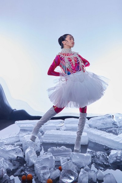 Alice trong một mẫu thiết kế ấn tượng của NTK Vương Khang. Để hiện thực hóa ý tưởng của ê kíp, model kid không ngại khó để tạo nhiều dáng thời trang cùng những cây nước đá lạnh.