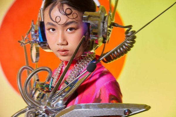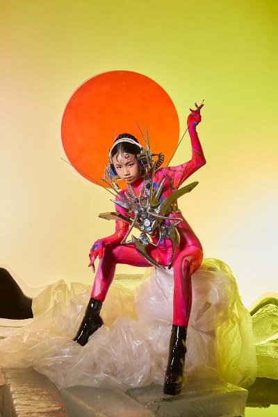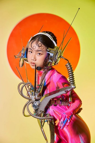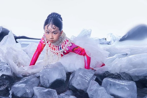 Người mẫu 12 tuổi Alice Nguyễn gây ấn tượng khi mặc các thiết kế lấy cảm hứng từ trí tuệ nhân tạo (AI), chuyển tải thông điệp về môi trường và biến đổi khí hậu.