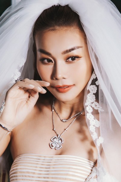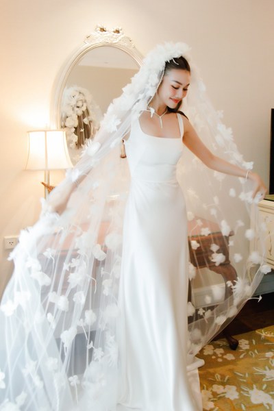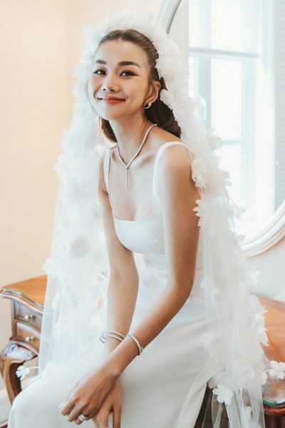 Bước lên lễ đường, Thanh Hằng mặc đầm tối giản bằng satin cao cấp, mang hơi hướng cổ điển, cùng khăn voan dài đính hoa 3D.