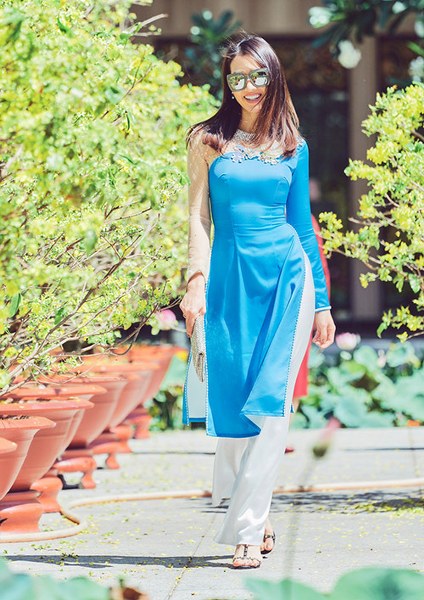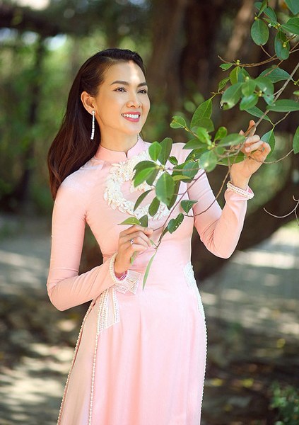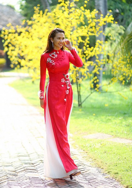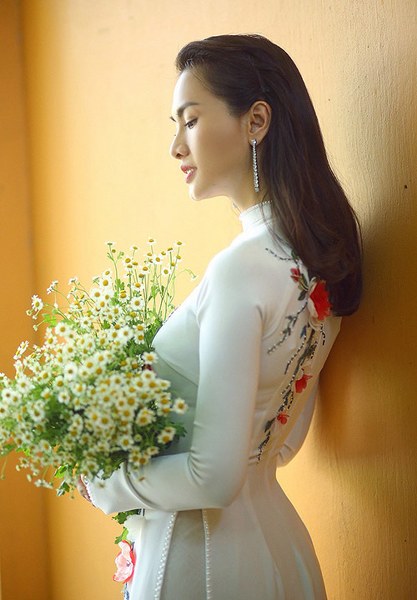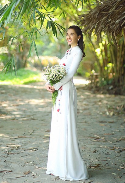 Diễn viên Anh Thư giới thiệu các mẫu áo dài ôm khít cơ thể, tôn đường cong hiệu quả của nhà thiết kế Minh Châu.