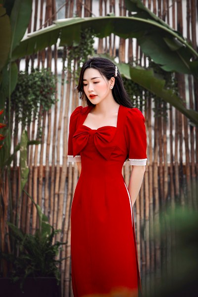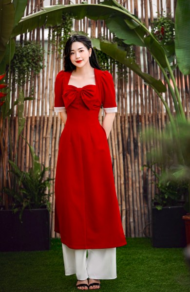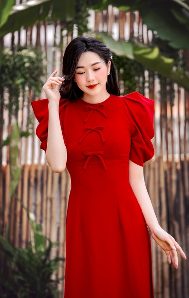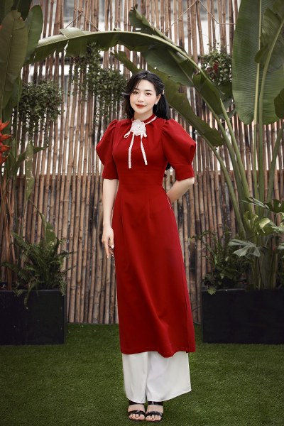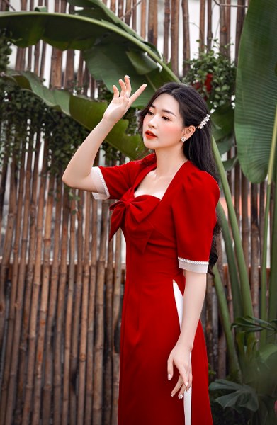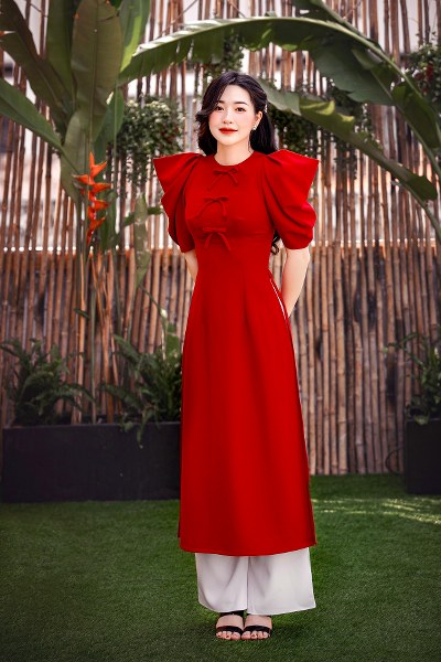 Áo dài dành cho dịp Tết được nhà thiết kế Nguyễn Hà Nhật Huy biến tấu nhẹ nhàng ở phần vai bồng, thắt nơ trẻ trung.