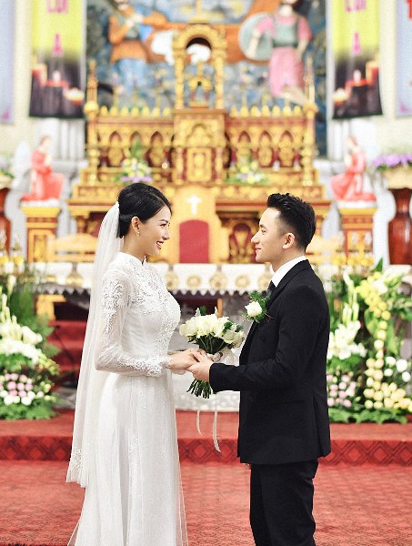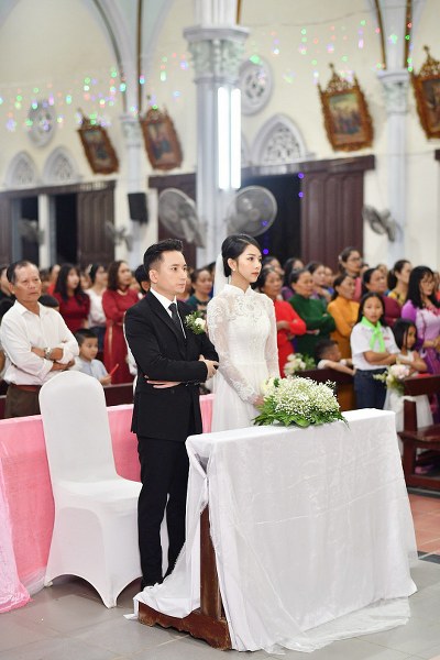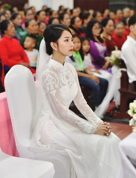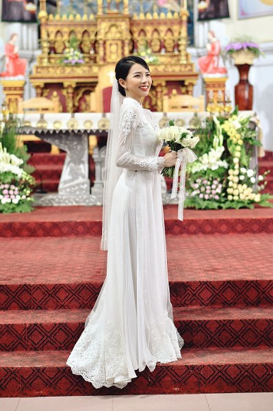 Vừa qua, cô dâu Huỳnh Khánh Vy diện áo dài có giá 40 triệu đồng, được may 4 lớp, điểm 8.000 viên đá Swarovski trong lễ cưới ở Nghệ An.