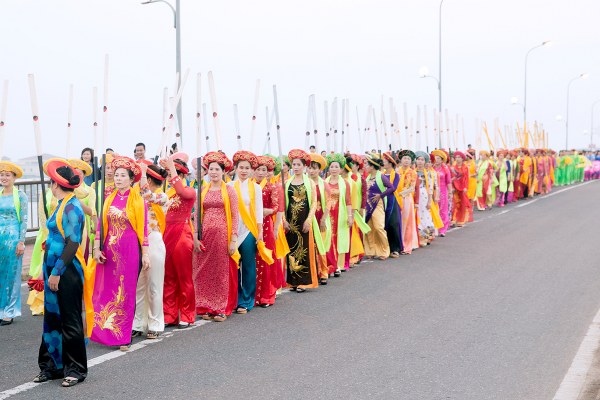 Ngoài những trang phục rực rỡ màu sắc thường thấy ở mọi lễ hội của NTK Ken Nguyễn, khoe những đường nét nóng bỏng của những vũ công, người mẫu, thì trang phục áo dài sẽ đốn tim du khách bởi sức hút của những người mẫu diễu hành tiếp nối nhau di chuyển trên đường phố.
