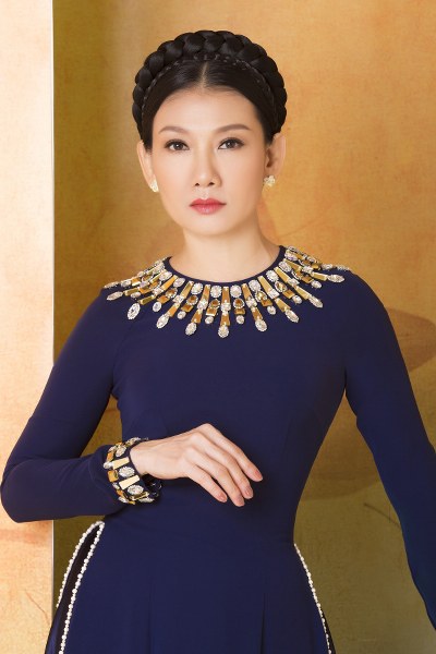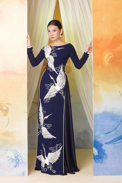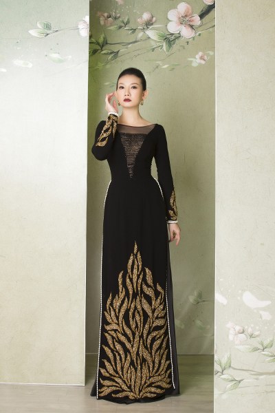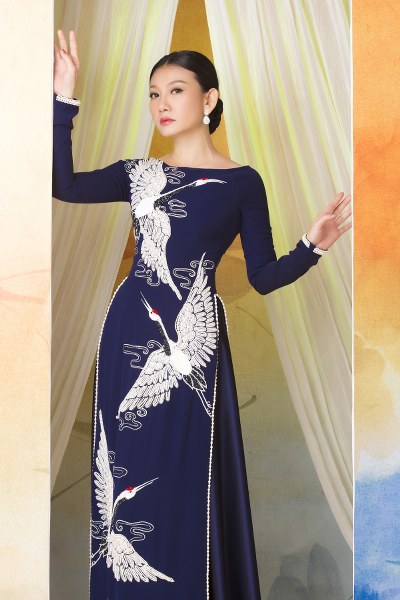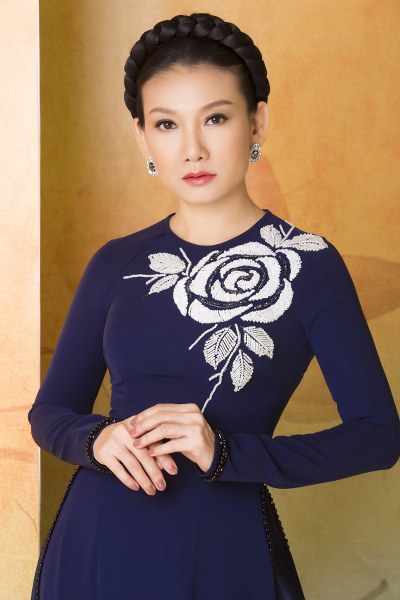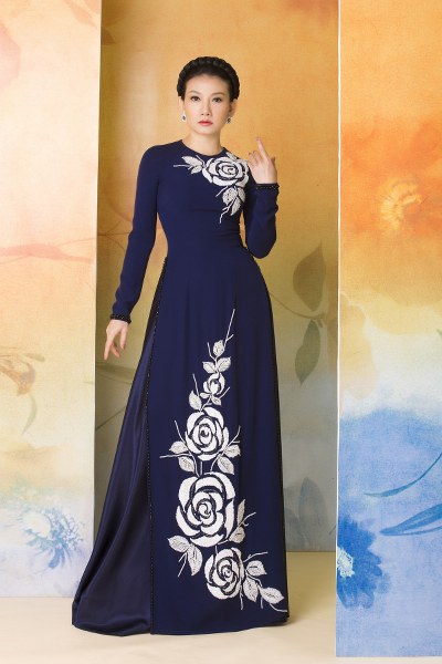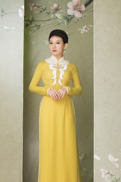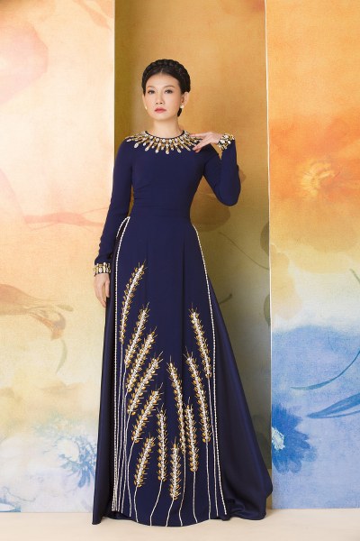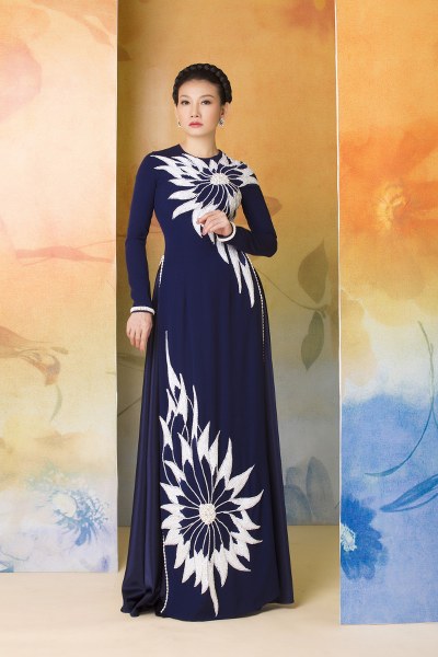 Áo dài chất liệu siêu tuyết được điểm xuyết hoạ tiết đính kết, giúp tôn dáng người diện độ tuổi U50.