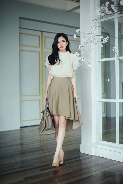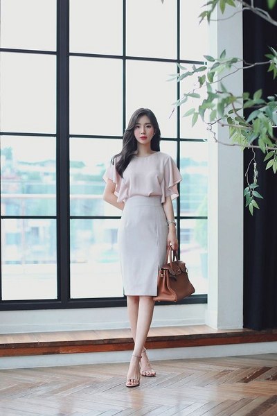 Phong cách thanh lịch cho chị em văn phòng vào mùa nắng với áo lụa rũ vai, chân váy bút chì xẻ tà và sandal màu nude quai mảnh
