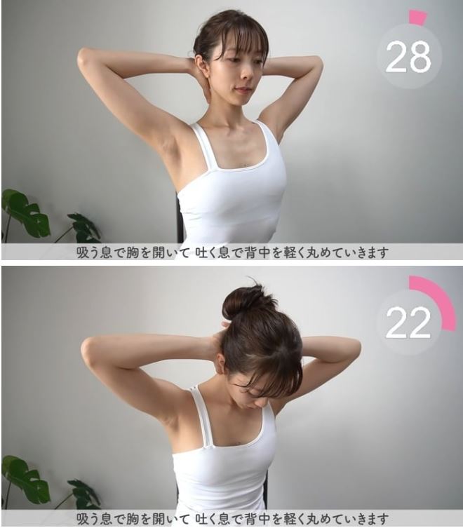 Bài tập 1: Đặt hai tay lên vai, sau đó từ từ xoay người ra sau trong 30 giây, khi xoay cố gắng mở và vươn vai hết mức có thể, đồng thời giữ tư thế ngồi thẳng và hít thở đều đặn. Quay về phía trước một lần nữa và lặp lại trong 30 giây.