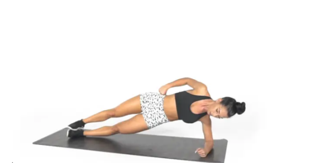 – Nằm bên phải với cẳng tay chống thẳng trên sàn nhà. Đặt tay trái ở bên hông của bạn. Duỗi thẳng chân, gồng chắc cơ trọng tâm và giữ hông cao khỏi thảm sao cho cả người hợp thành một đường thẳng từ đầu đến chân. Bàn chân có thể được đặt so le để giữ thăng bằng tốt hơn hoặc xếp chồng lên nhau để tăng độ khó cho động tác.