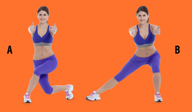 Đứng thẳng, hai chân mở rộng bằng một vai, hai tay duỗi thẳng trước ngực, lòng bàn tay hướng vào nhau. Hạ thấp trọng tâm, lùi chân trái về sâu phía sau bên phải sau đó đứng dậy và đổi bên. Thực hiện động tác 30 lần.