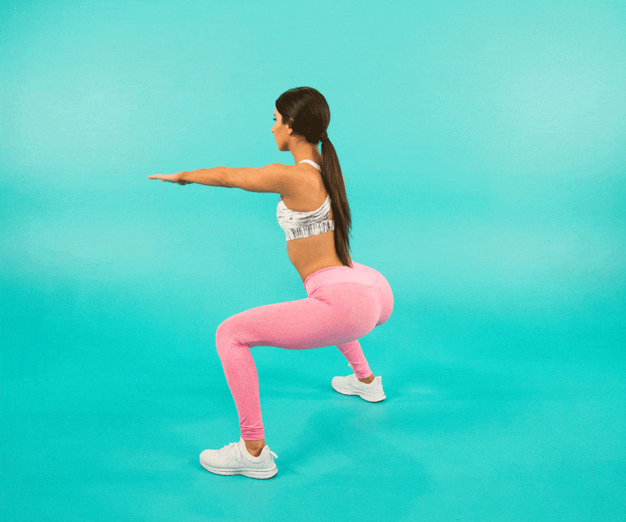 Hai chân mở rộng sang hai bên, tiến hành tập động tác squat, hai tay song song trước ngực, cố gắng để lưng tạo thành một đường thẳng, di chuyển lên xuống liên tục.