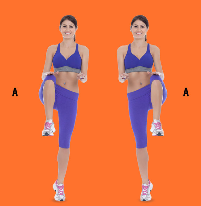 Đứng thẳng, hai tay gập vuông góc để trước ngực. Thực hiện động tác rút gối nhanh chạm tay lần lượt mỗi bên 30 lần.