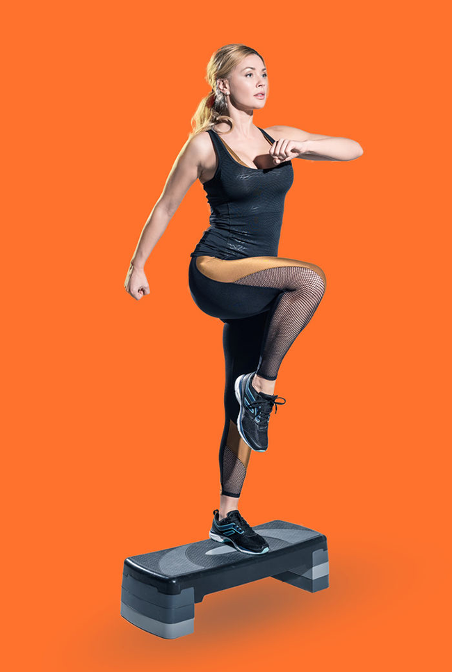 Chuẩn bị một bục nhỏ, thực hiện động tác bước lên bục, rút gối cao, đánh tay, mỗi bên 30 lần.