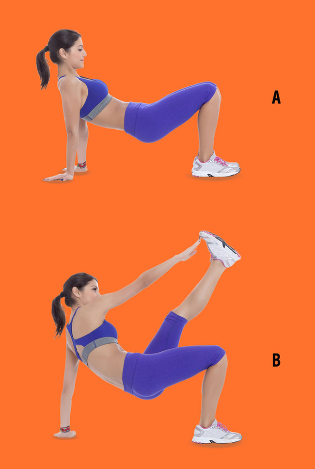 Chống đẩy ngược, đá chân và tay ngược bên lên cao chạm nhau. Thực hiện động tác 30 lần mỗi bên.