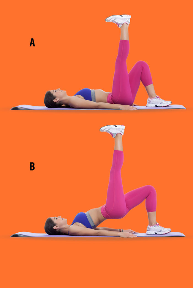 Nằm ngửa, đầu gối co, hai tay duỗi thẳng, đưa một chân thẳng lên trời, nâng hông lên cao. Thực hiện động tác 30 lần mỗi chân.